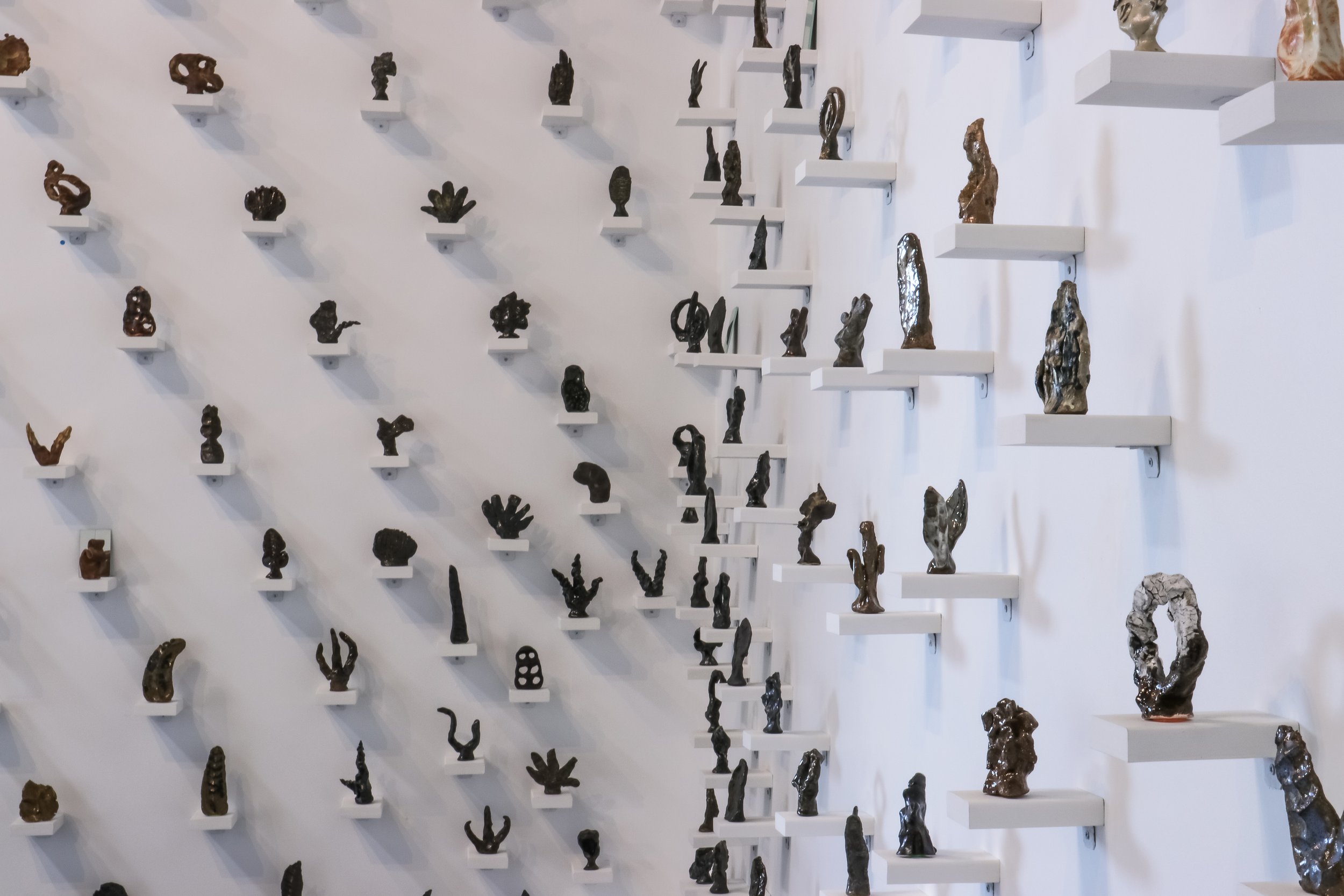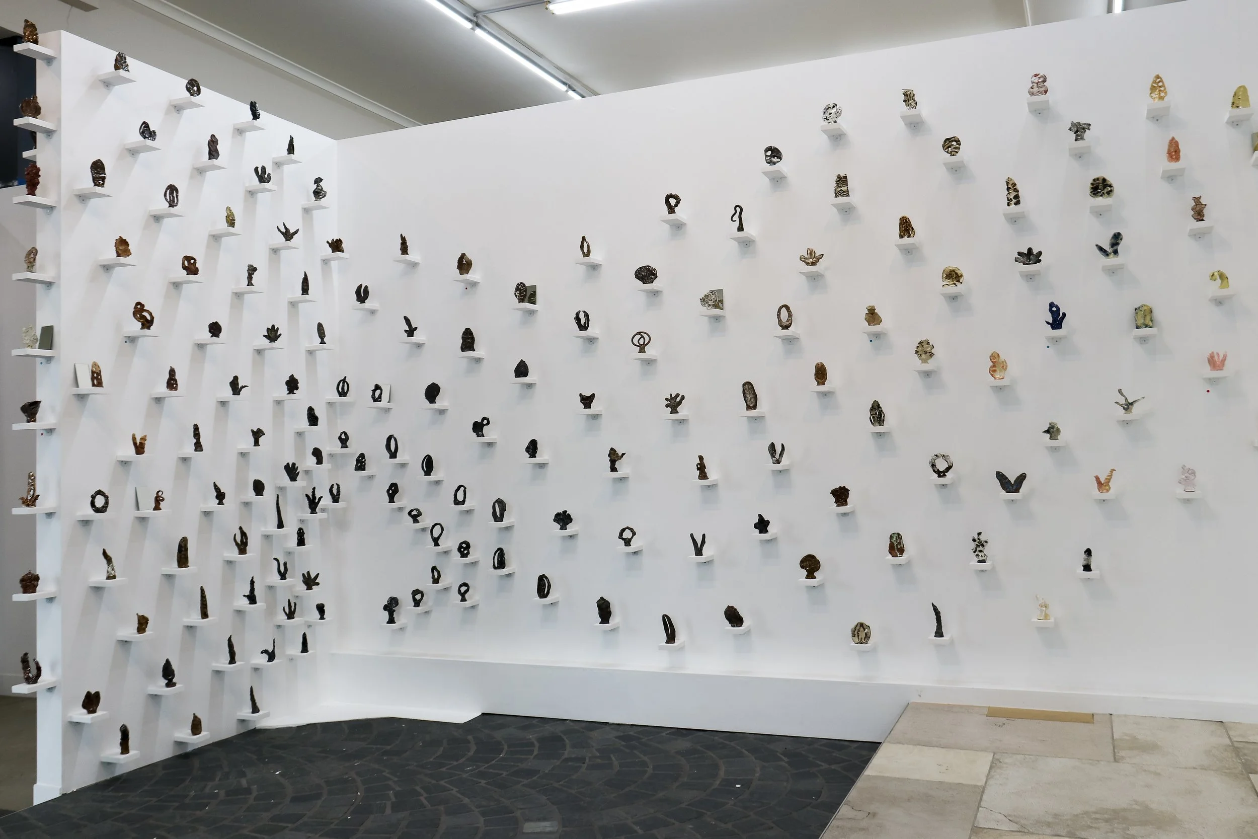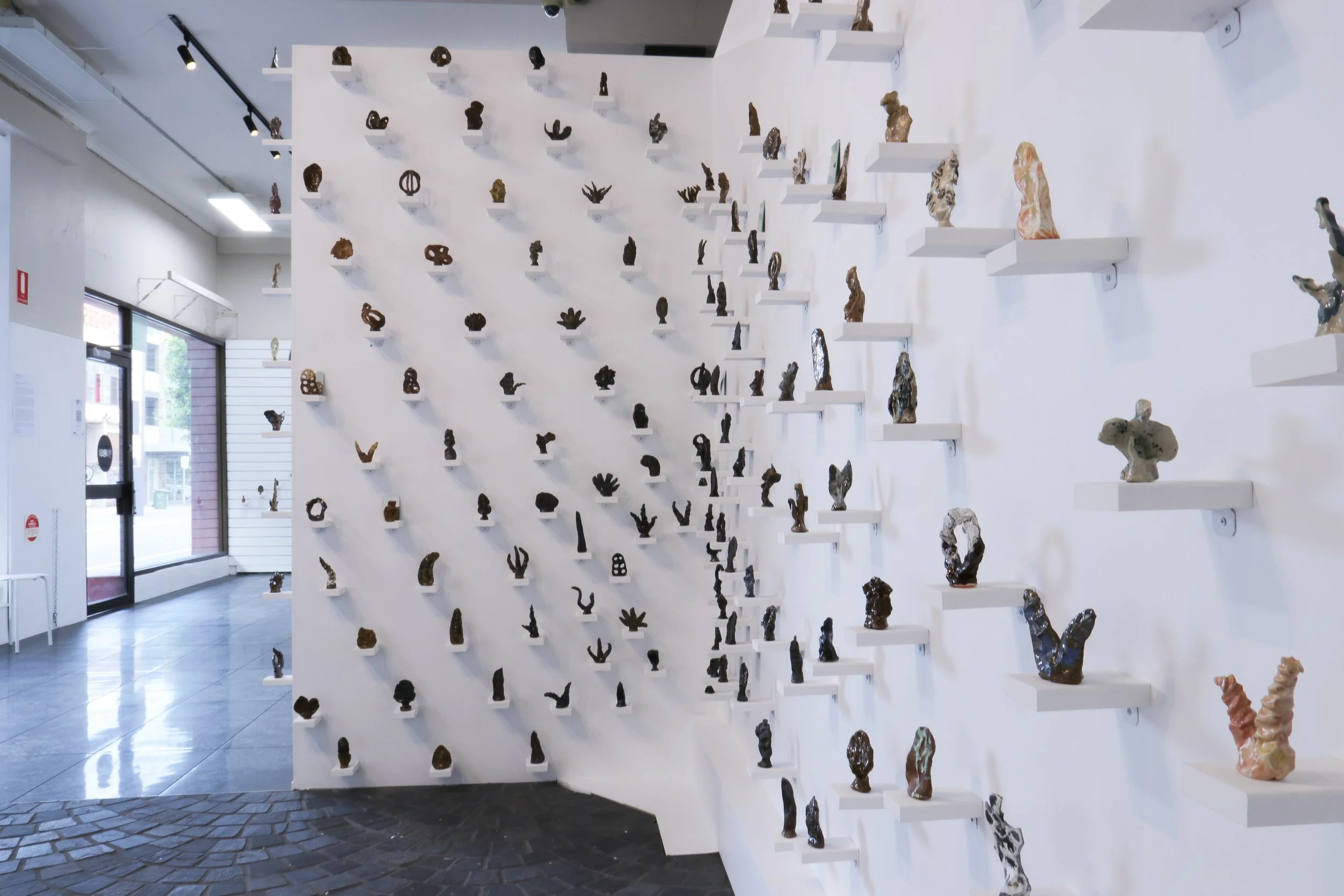 In Lexical Items linguistics and materiality converge, exploring concepts of interconnectedness and the relationship between individual parts and a greater whole. This installation consists of several hundred ceramic sculptures displayed on individual shelves across the gallery walls. Each individual piece performs as a ‘lexical item’, a basic abstract unit of meaning, a set of forms taken by a single root word. Here the root word is the material – clay – and its variations created through an intuitive process of hand-forming and experimental glaze treatments.
